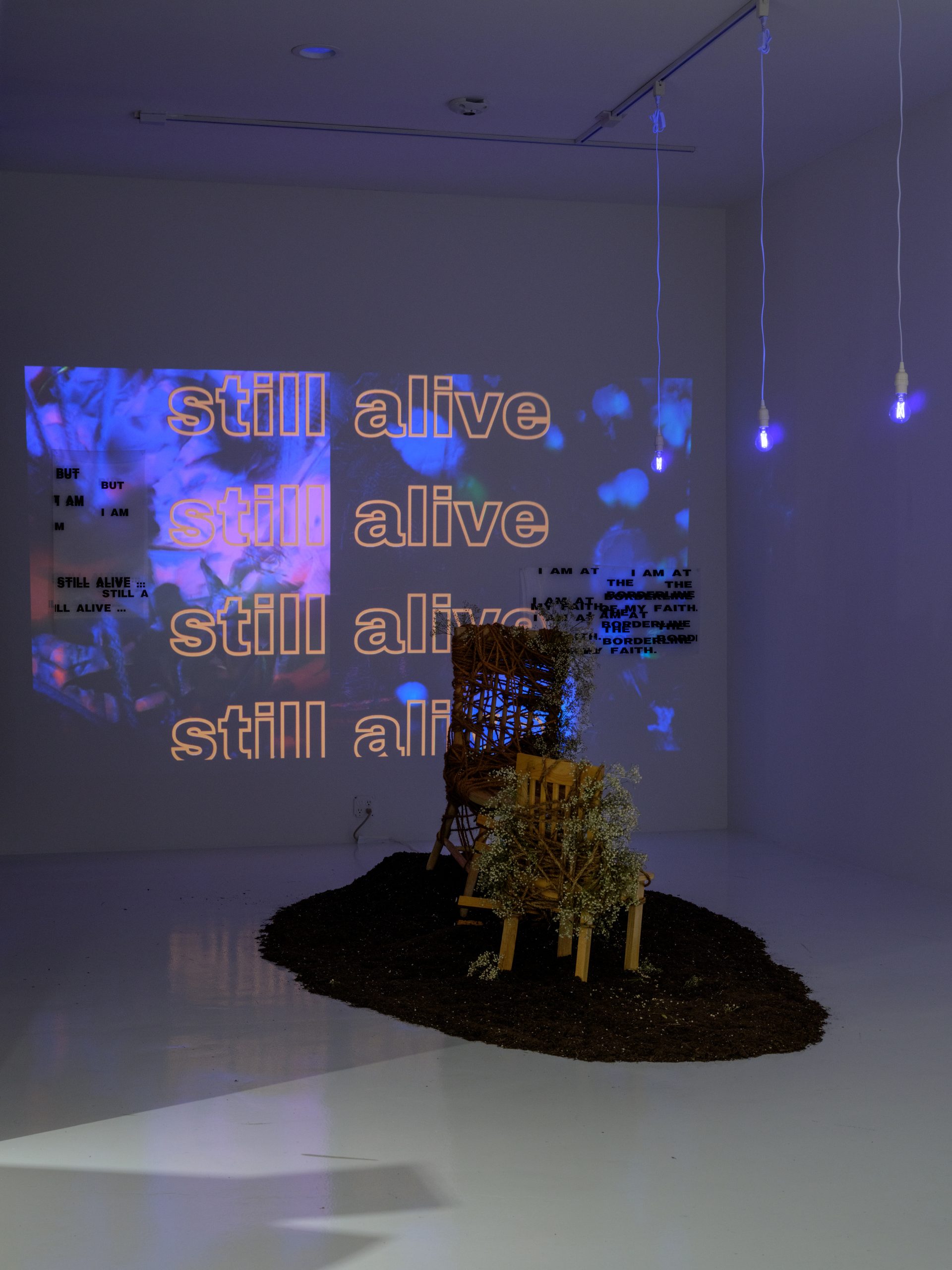Installation, Video projection, chairs, jute rope, manila rope, gypsophila paniculata, dirt & soil